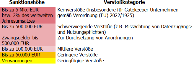 Verstöße gegen die Verpflichtungen des Data Act können mit Bußgeldern geahndet werden. Der Entwurf sieht vor, dass die BNetzA zunächst eine Verwarnung aussprechen kann, um Unternehmen die Möglichkeit zu geben, Verstöße zu beheben, bevor Bußgelder verhängt werden. Detaillierte Regelungen, einschließlich Staffelung bis zu 5 Mio. Euro oder 2% des weltweiten Jahresumsatzes bei schwerwiegenden Verstößen großer Unternehmen, sind in der Executive Summary dargestellt.