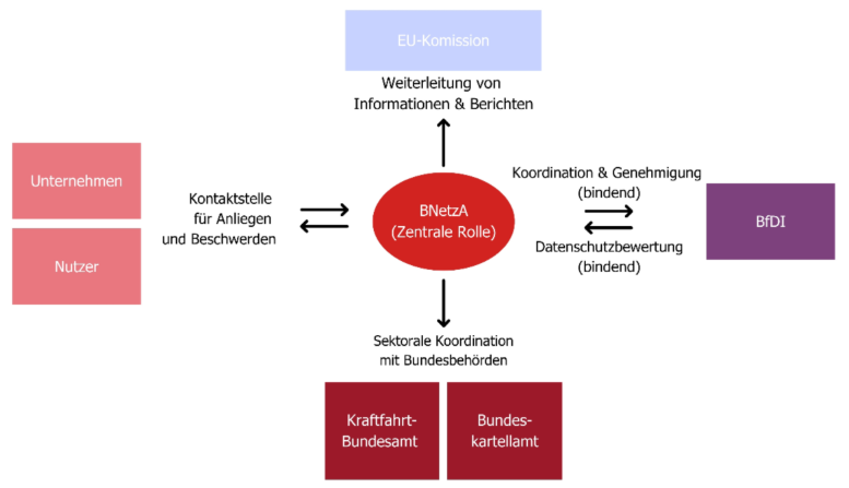 Die BNetzA soll zentrale Ansprech- und Beschwerdestelle, Aufsichtsbehörde, Koordinationsstelle für Behördenkooperation sowie Meldestelle an die EU-Kommission werden; sie kann Adressat und Ansprechpartner für Unternehmen und Nutzer gleichermaßen sein.